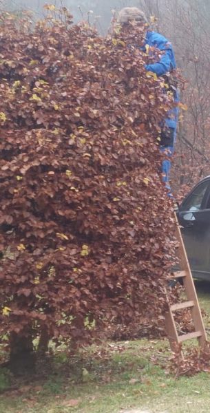 sorgsam die Hecke hinter dem Holzschober. Klasse Frisuren, super Arbeit.